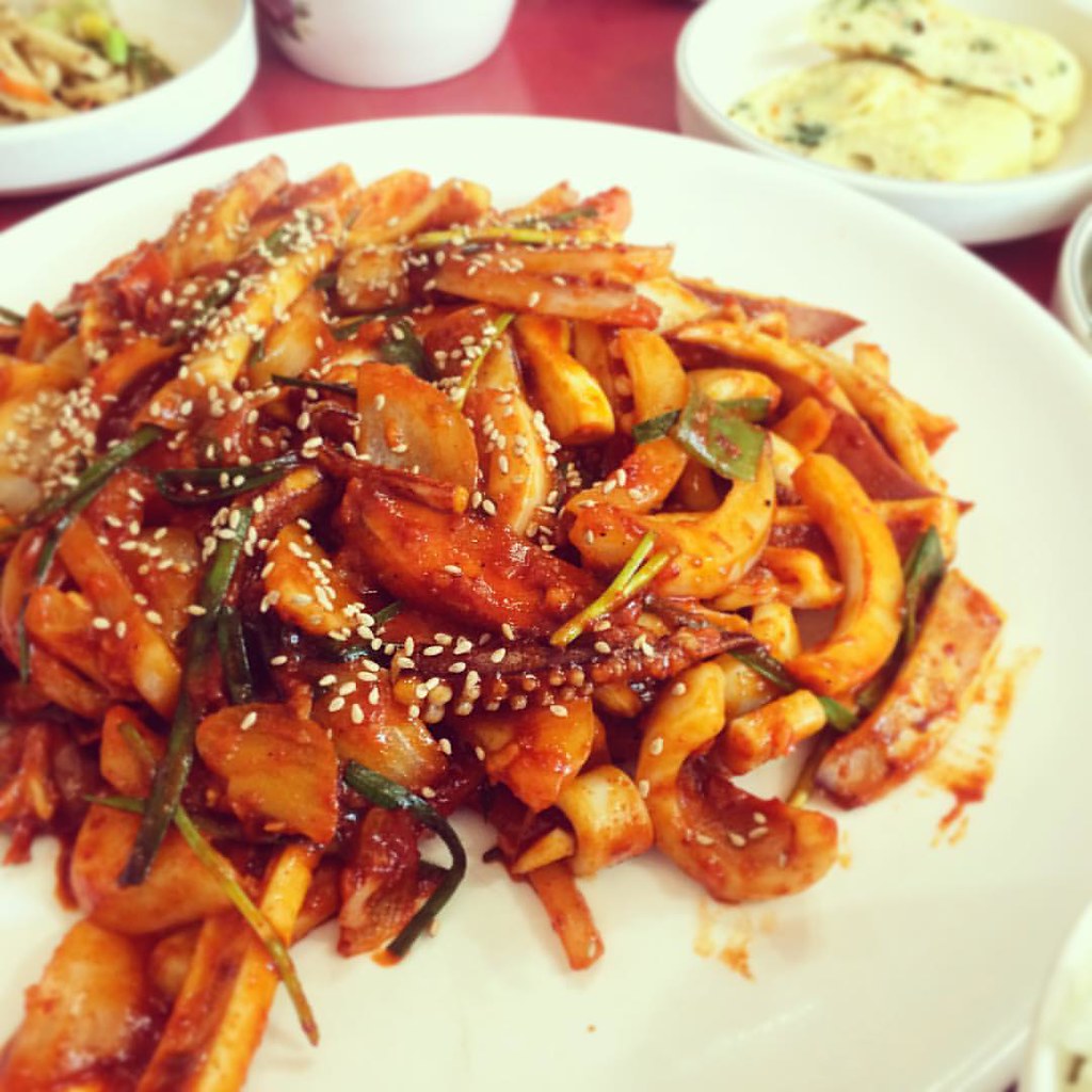 "오징어볶음," also known as Stir-fried Squid, a traditional Korean dish loved for its savory and slightly spicy flavor profile: